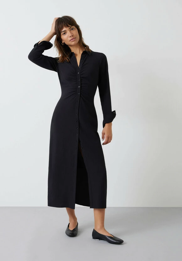 We love how flattering ruched detailing is, and we also love that it taps into the early 2000s revival that’s influencing the fashion world right now. Our Gianna shirt dress is ruched at the front with button fastenings, made from a stretchy textured fabric to add interest to its classic black tone.