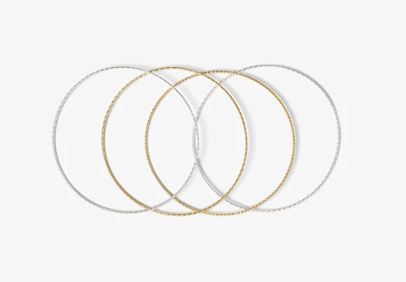Made from a mix of gold and silver-plated brass, our solid Lyrah bangles can be slipped on solo as an instant stack, or layered up with chunkier styles and beaded bracelets. Transition them through the seasons by letting them peer out from under full-length cuffs instead of summer’s cropped sleeves.