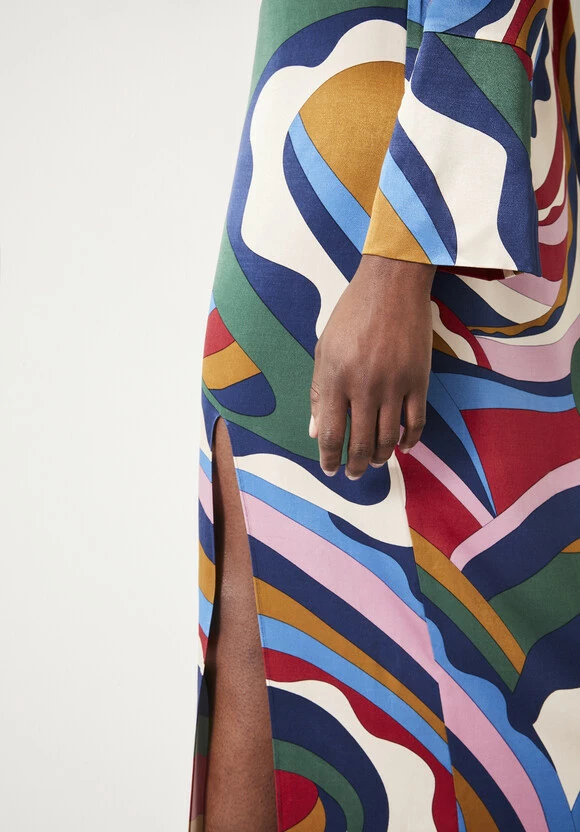 We’re always drawn to those styles that make a statement, and it doesnt get more attention-grabbing than the colourful print swirling across our Rita dress. Cut from slinky satin to form a floor-length silhouette, it’s finished with wide sleeves and a 60s-inspired mock-neck collar.